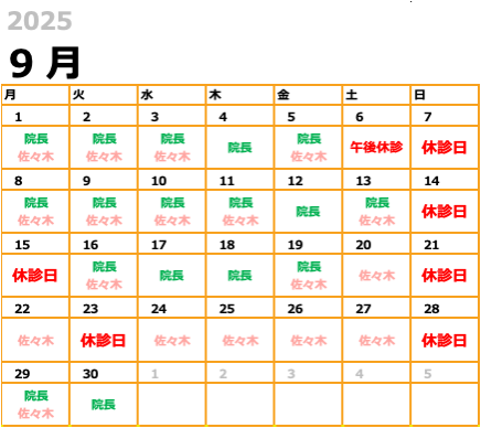 9月の休診日は、毎週日曜と、祝日(15日敬老の日、23日秋分の日)となっております。