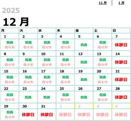 12月の休診日は、毎週日曜日と、年末30日(火)、31日(水)となります。